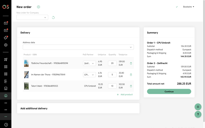 With our print-on-demand service, you can manage your print business to adapt flexibly to changing demands. Bookwire OS reports your PoD products to book wholesalers, shops and printers and ensures production and delivery to your customers after the order is received. Of course, individual print orders and drop shipment orders can also be added.
